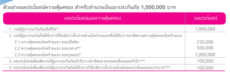- จำนวนเงินเอาประกันภัยขั้นต่ำ 100,000 บาท ไม่เกิน 5 เท่าของทุนชีวิต