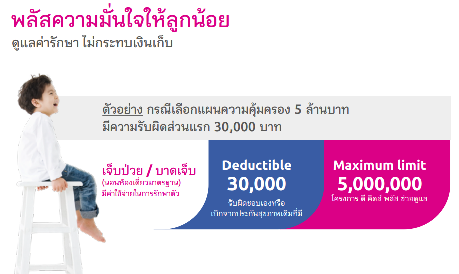 โครงการดี คิดส์ พลัส (D Kids Plus) จึงช่วยให้ความคุ้มครองเรื่องสุขภาพของลูกน้อย พร้อมช่วยแบ่งเบาค่ารักษาพยาบาล ด้วยความคุ้มครองแบบเหมาจ่ายในวงเงินเดียว เพื่อโอกาสในการรักษาที่มีประสิทธิภาพได้เห็นลูกเติบโตอย่างแข็งแรง พ่อแม่ก็วางใจ และคลายกังวลยามลูกน้อยเจ็บป่วย