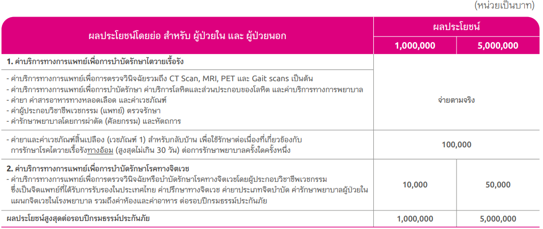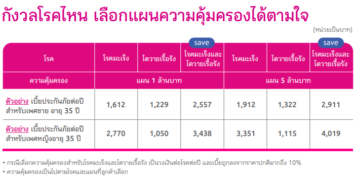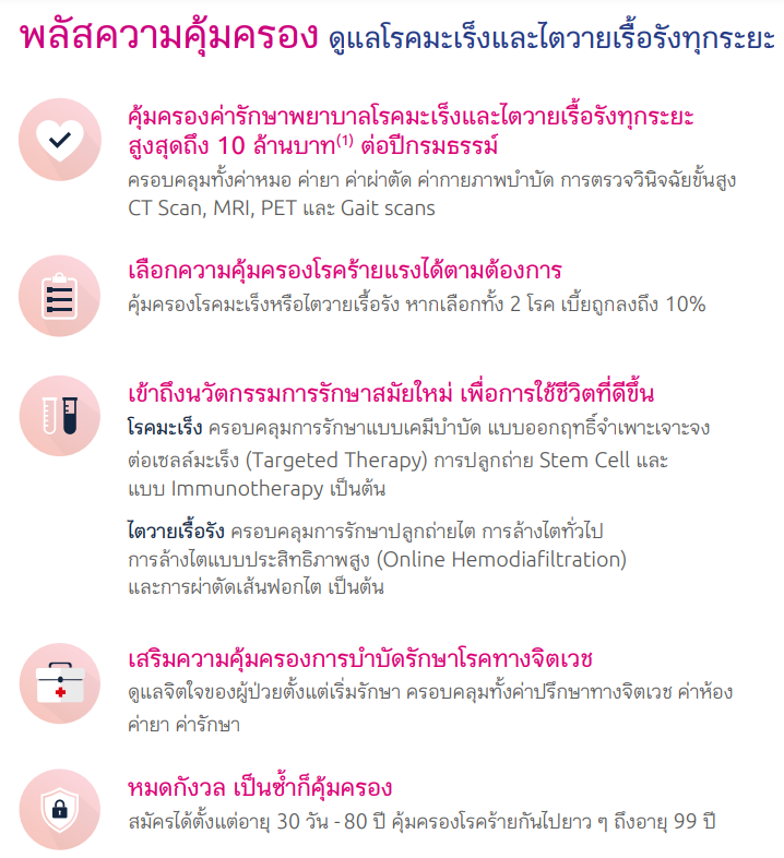 เหมาะสำหรับผู้ที่กำลังมองหา ประกันโรคร้ายที่ออกแบบมาเพื่อดูแลโรคมะเร็งและไตวายเรื้อรัง คุ้มครองค่ารักษาพยาบาลโรคมะเร็งและไตวายเรื้อรังทุกระยะรวมกันสูงสุดถึง 10 ล้านบาท(1) ครอบคลุมนวัตกรรมการรักษาสมัยใหม่ทั้งผู้ป่วยใน (IPD) และผู้ป่วยนอก (OPD)