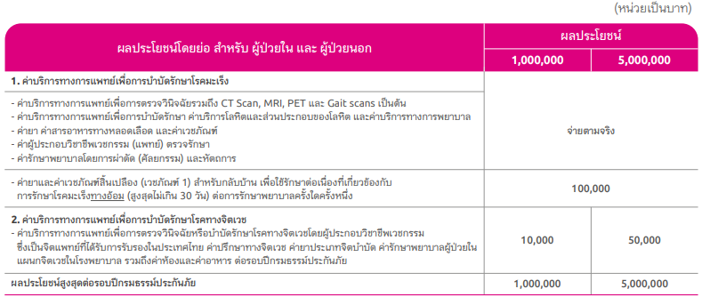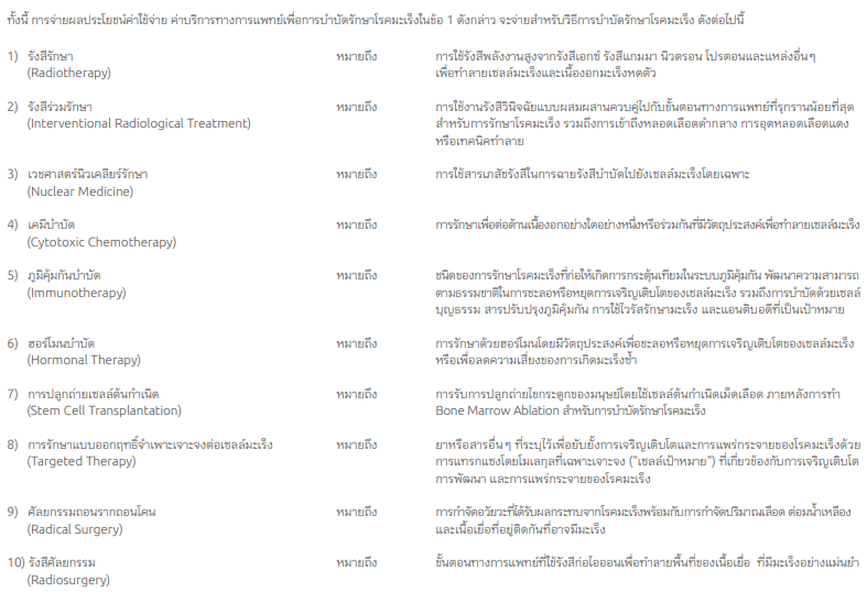 ในส่วนที่เกี่ยวกับความคุ้มครองการรักษาโรคมะเร็งหรือ ประกันมะเร็ง ครอบคลุมการรักษาแบบเคมีบำบัด แบบออกฤทธิ์จำเพาะเจาะจงต่อเซลล์มะเร็ง (Targeted Therapy) การปลูกถ่าย Stem Cell และแบบ Immunotherapy